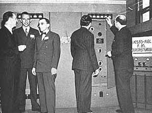 At Station KSFO in San Francisco, in 1940, Frank Gunther (second from left) demonstrates REL equipment to NAB members.